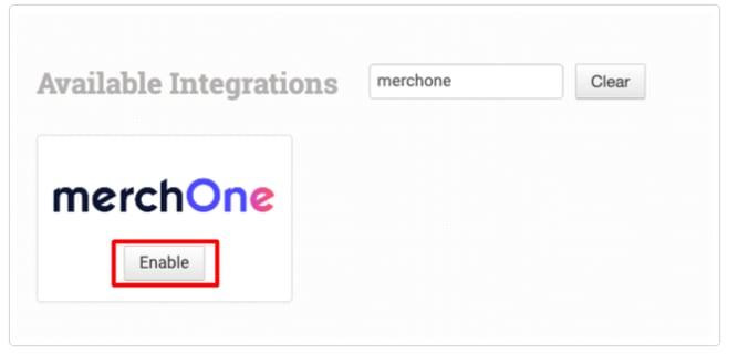 Alternatively, click on Manage Integrations from the dashboard and search for merchOne from the available integrations and enable it.