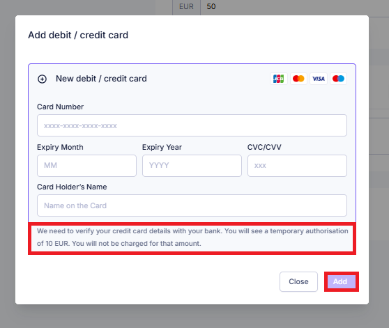Click Add to save your payment method. Once your credit card is added, you can deposit funds into your wallet. Please note that a temporary authorization of 10 Euro will appear on your statement, but you will not be charged this amount.